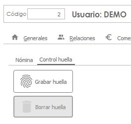 1.- Realizada la activación del módulo de reconocimiento de huellas por parte de Winmotor, se añadirá la grabación y borrado de huella existente a los usuarios, accediendo a la entidad > Datos Trabajador > Control Huella: